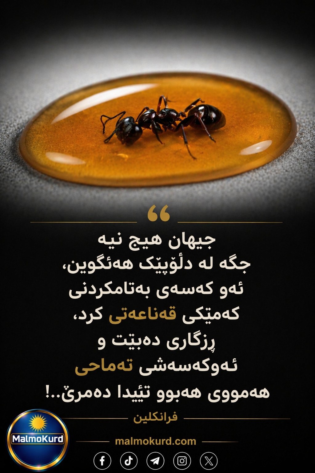 لەسەر زەوی کەوتبوو مێرولەیەک بەلایدا تێپەری تامێکی کرد،ویستی بڕوات بەڵام تامی هەنگوینەکەی زۆر بەلاوە خۆشبوو،دیسان گەڕایەوە. کەمێکی تری لێ خوارد،دواتر بیری کردەوە،ئەو کەم کەمە خواردنە تێری ناکات،بۆیە چووە ناو دڵۆپە هەنگوینەکەوە و کەوتە خواردنی.