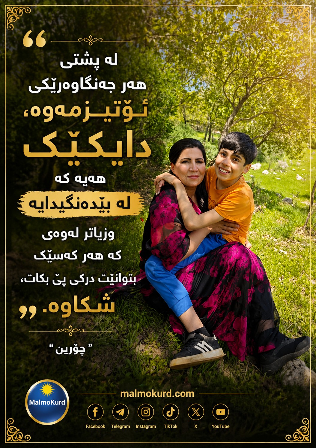 خاتوونی ڕۆژنامەنووس چۆرین، کە لە نوسینگەی بادینانی پوکمیدیا کاردەکات، سەرەڕای دڵسۆزی و خۆشەویستی بۆ کارەکەی، دایکایەتیەکی بێ وێنە بۆ دوو منداڵە توشبووەکەی بە ئۆتیزم دەکات و هیچ کاتێک پیشەکەی پشتگوێ نەخستووە، ئەمڕۆ لە ئەکاونتی خۆی لە تۆڕی کۆمەڵایەتی فەیسبووک لەبارەی دایکان و ڕۆڵەکانیان نوسیوویەتی: