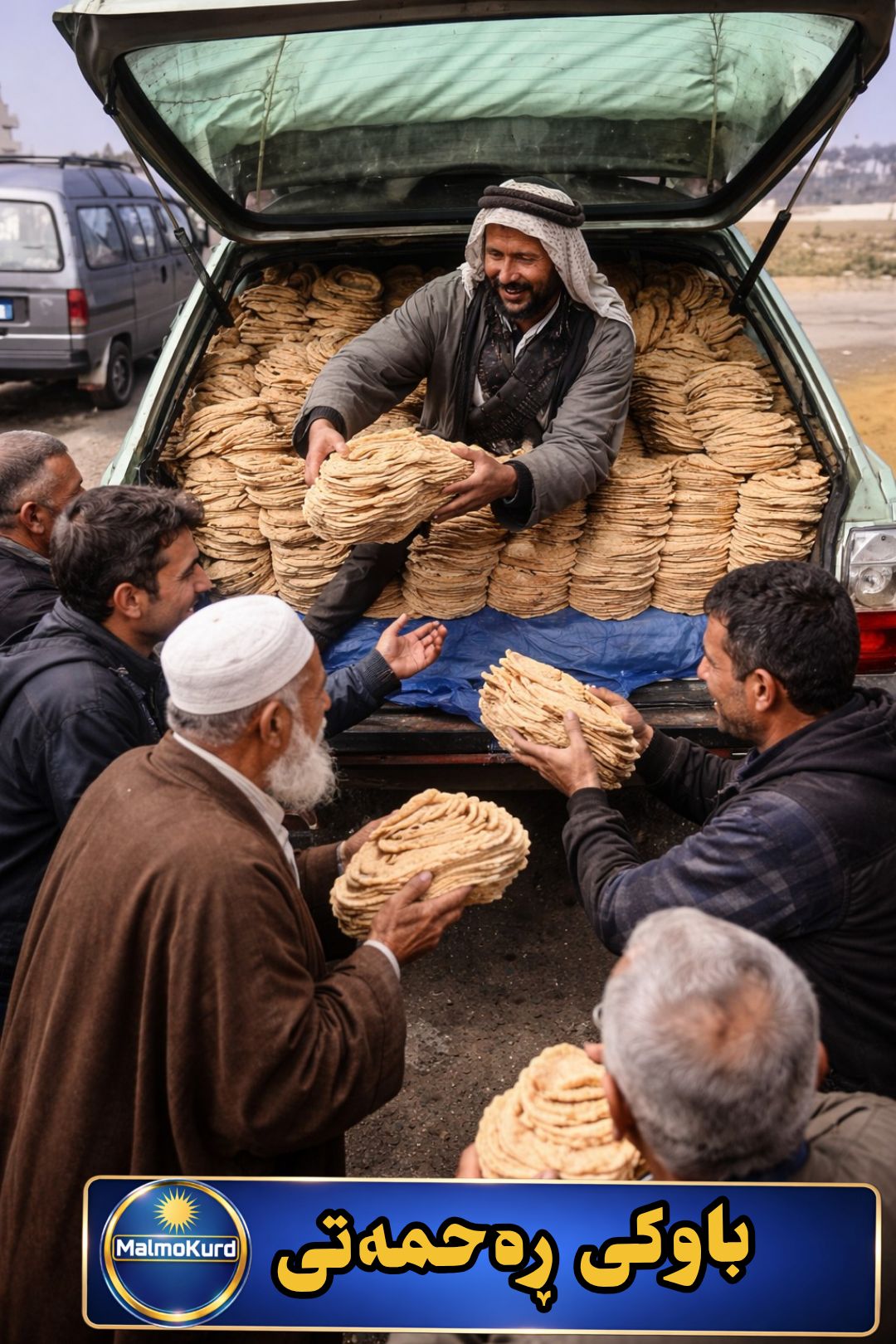 کابرایەک ئوتومبێلەکەی پڕ لە نان دەکا و وێنەیەکی باوکیشی دەدا لە جامی پێشەوە.